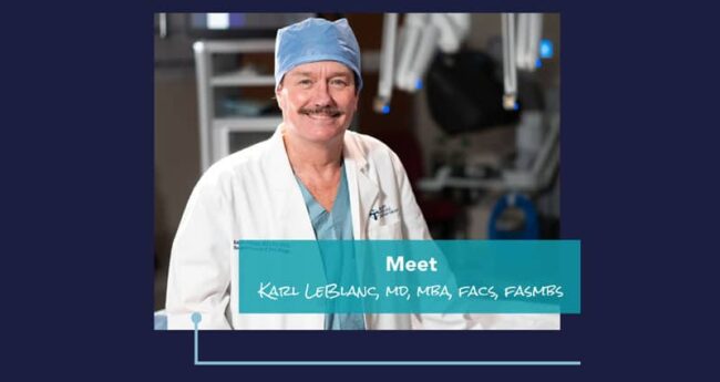 Karl LeBlanc, MD, MBA, FACS, FASMBS, general and bariatric surgeon at Our Lady of the Lake Physician Group Bariatric and Metabolic Institute and The Surgeons Group of Baton Rouge, has been preparing for a career as a physician for most of his life. “As a child, I enjoyed caring for the animals on the farm…