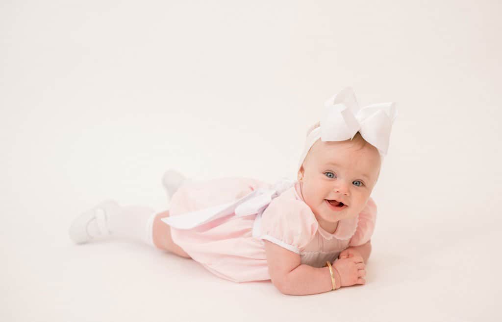 A girl toddler wearing a pink bow in her hair